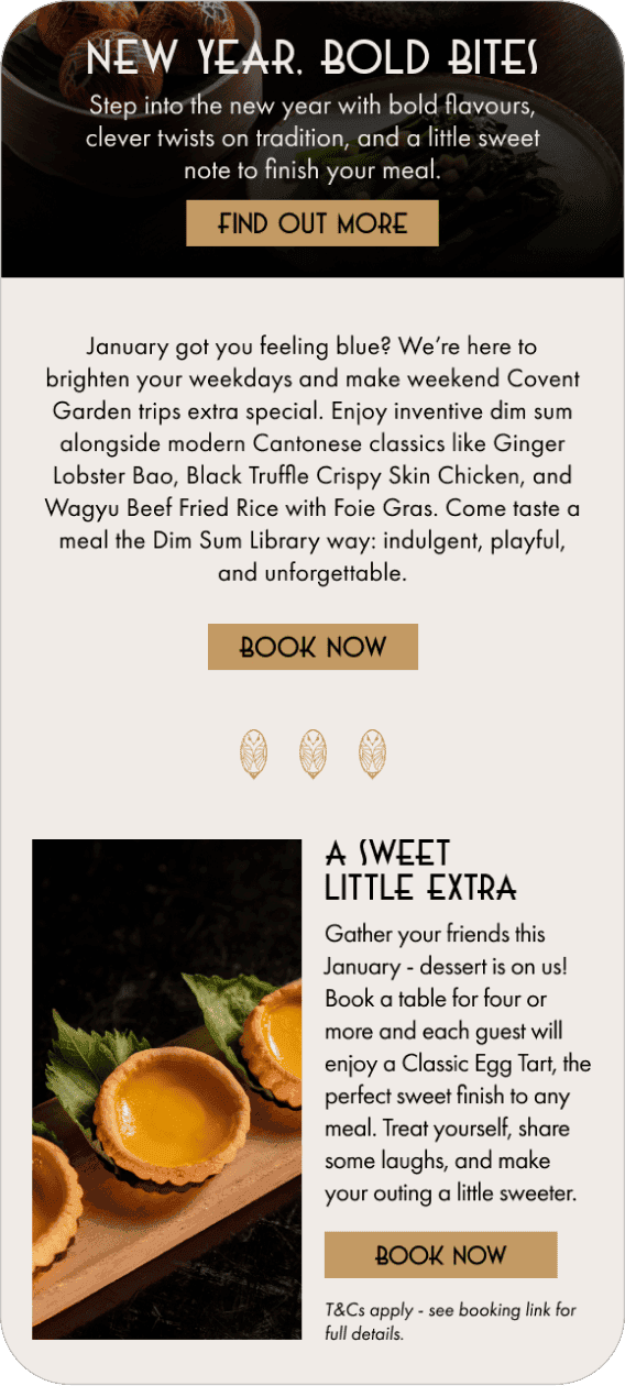 The designs extended the restaurant’s black and gold Art Deco identity across print, digital and in-restaurant formats, creating a consistent visual presence for the opening.
